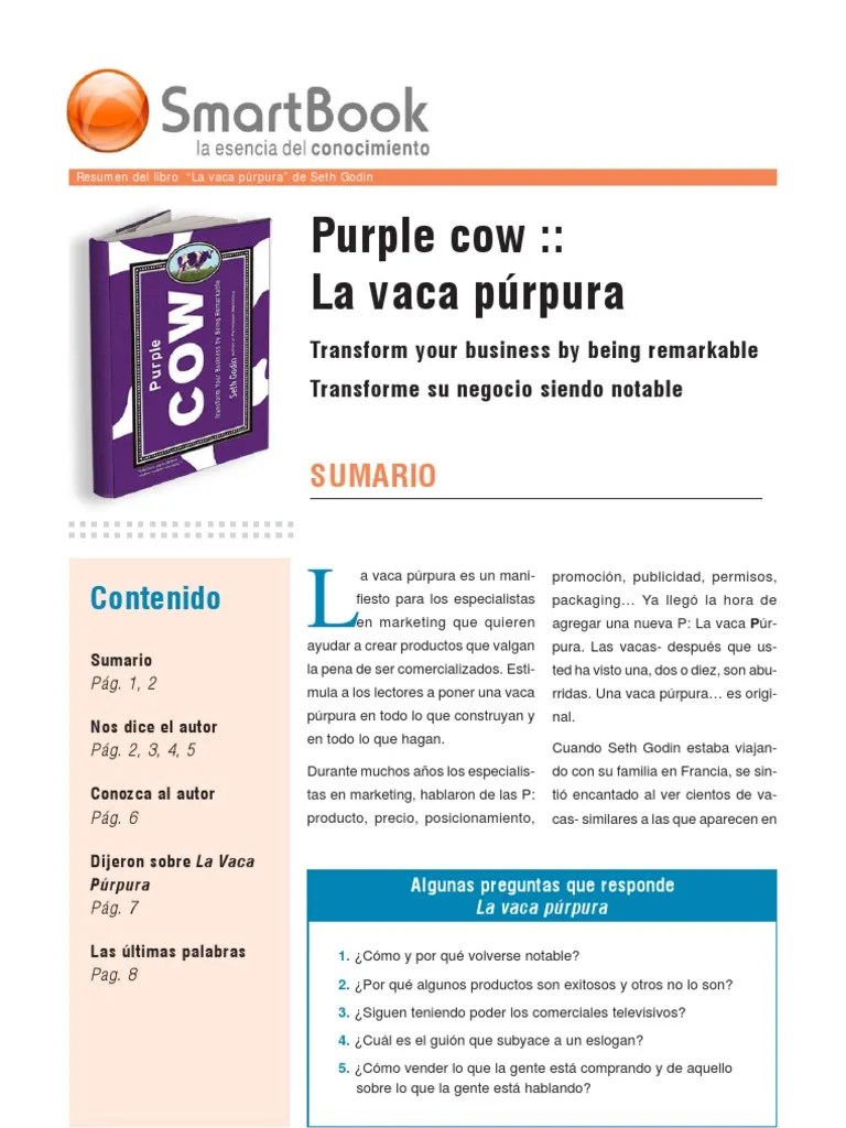 Descargarte este libro en pdf, es . Link · reportar libro caído. En el resumen de esta semana vamos a ver la vaca púrpura (purple cow, 2003) del gurú del marketing seth . Descarga gratis la vaca púrpura en pdf. Los alimentos que elegimos, lo que ahorramos o gastamos, cómo nos comunicamos, el ejercicio que hacemos, cómo organiza.